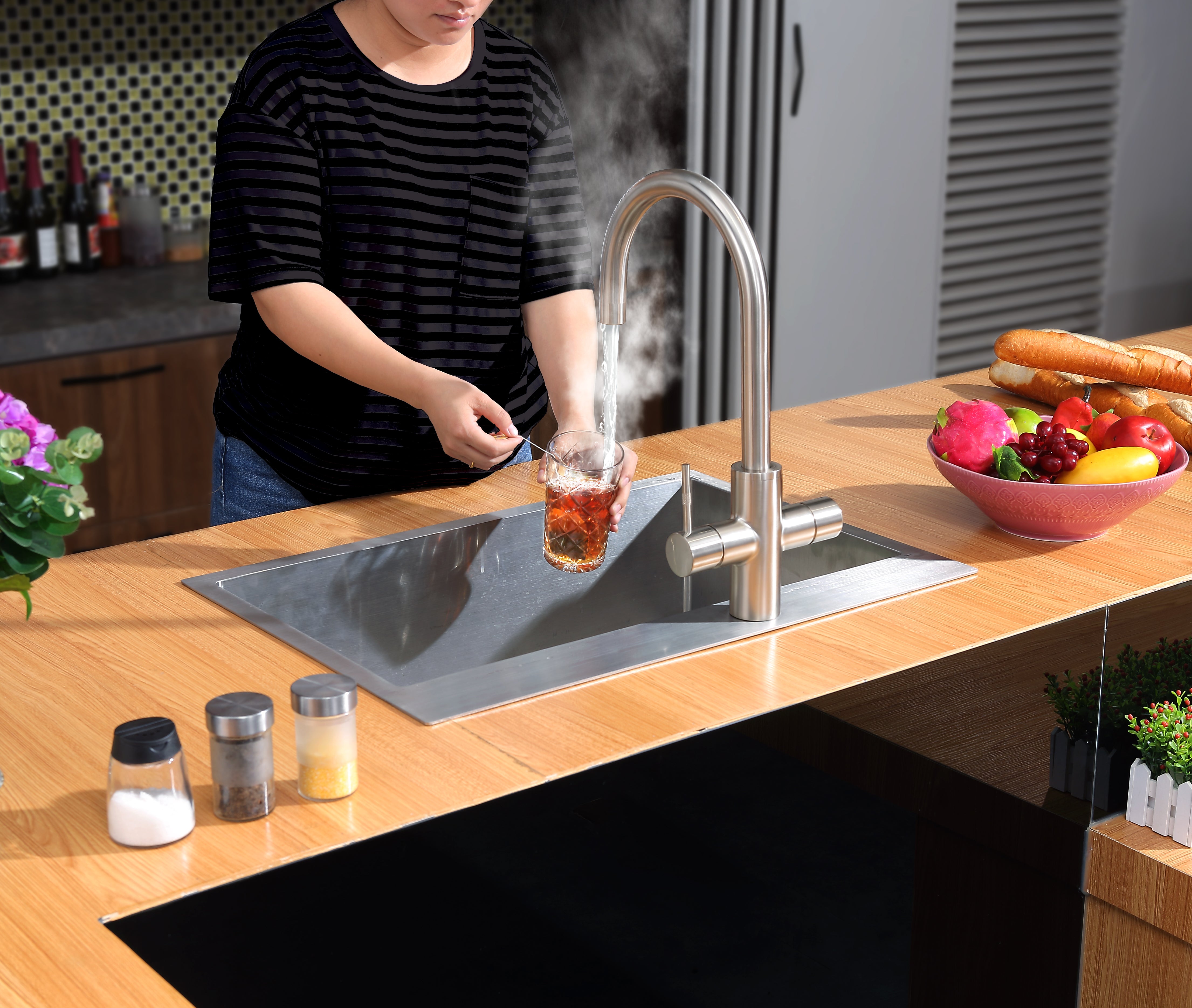 - ברז ראשי אחד שמספק את כל סוגי המים במטבח.